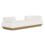 The sofa features soft, tailored upholstery with a distinctive teak base reminiscent of a ship’s hull. The arms of the sofa are rotatable by easily lifting and turning 90 degrees to form a tête-à-tête seating arrangement. The standard direction of the cushion fabric is off-the-bolt, therefore two seams run across the sofa in line with the edge of the arms. Seat cushion can be changed to fully boxed rather than waterfall to avoid any seams running across the top of the seat cushion. Teak Finish Available in Natural, Weathered, Clear Sealer, and Yacht. Fitted furniture cover is available.